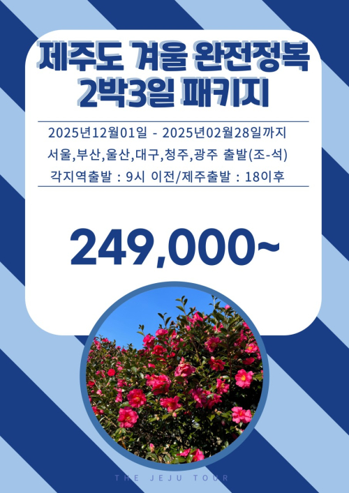 제주도 겨울 완전정복 2박3일 패키지 페이지 정보 목록 제주도 겨울 완전정복 2박3일 패키지 여행지 제주도 상품가 249,000원~ 출발일 25년 12월 ~ 26년 2월 포함사항 왕복항공, 공항세, 유류할증료, 호텔2박, 차량, 입장료, 식사(2조식, 3중식), 가이드 불포함 기사 및 가이드경비 (1인당 3만원), 석식, 여행자보험, 유류할증료 인상분 특전사항 예약하기 인쇄 예약하기 예약일자 예약자 * 휴대폰 * 이메일 기타 * 예약하기 * 예약시 기입하신 번호로 직원과 상담후에 예약이 확정됩니다. 여행상품소개 본문 이전글 제주도 겨울 힐링투어 3박4일 패키지 25.10.28 다음글 제주도 겨울 힐링투어 2박3일 패키지 25.10.28 목록