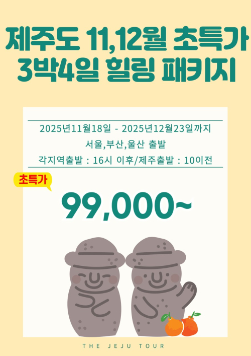 제주도 3박4일 힐링패키지 페이지 정보 목록 제주도 3박4일 힐링패키지 여행지 제주도 상품가 99,000원~ 출발일 25년 11월 18일 ~ 12월 23일 포함사항 왕복항공, 공항세, 유류할증료, 호텔3박, 차량, 입장료, 식사(3조식, 2중식), 가이드 불포함 기사 및 가이드경비(1인당 3만원), 석식, 여행자보험, 유류할증료 인상분 특전사항 오메기떡, 생수 제공 예약하기 인쇄 예약하기 예약일자 예약자 * 휴대폰 * 이메일 기타 * 예약하기 * 예약시 기입하신 번호로 직원과 상담후에 예약이 확정됩니다. 여행상품소개 본문 이전글 제주도 식도락 맛기행 2박3일 25.10.22 다음글 제주도+가파도+우도 3박4일 초특가 25.10.22 목록